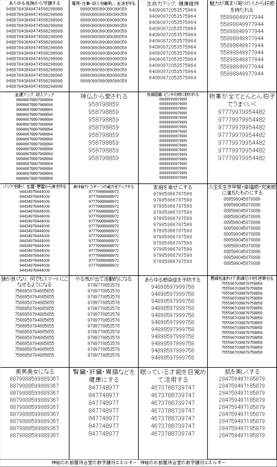 各種数字護符の例です。同様に護符を作成ください。推奨個数並べて書くだけで作れます。手書きでも良いです。