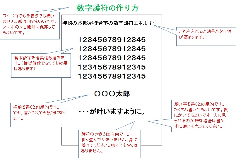 数字護符の作り方です。同様に護符を作成ください。複数の数字を並べても、複数枚所持しても構いません。